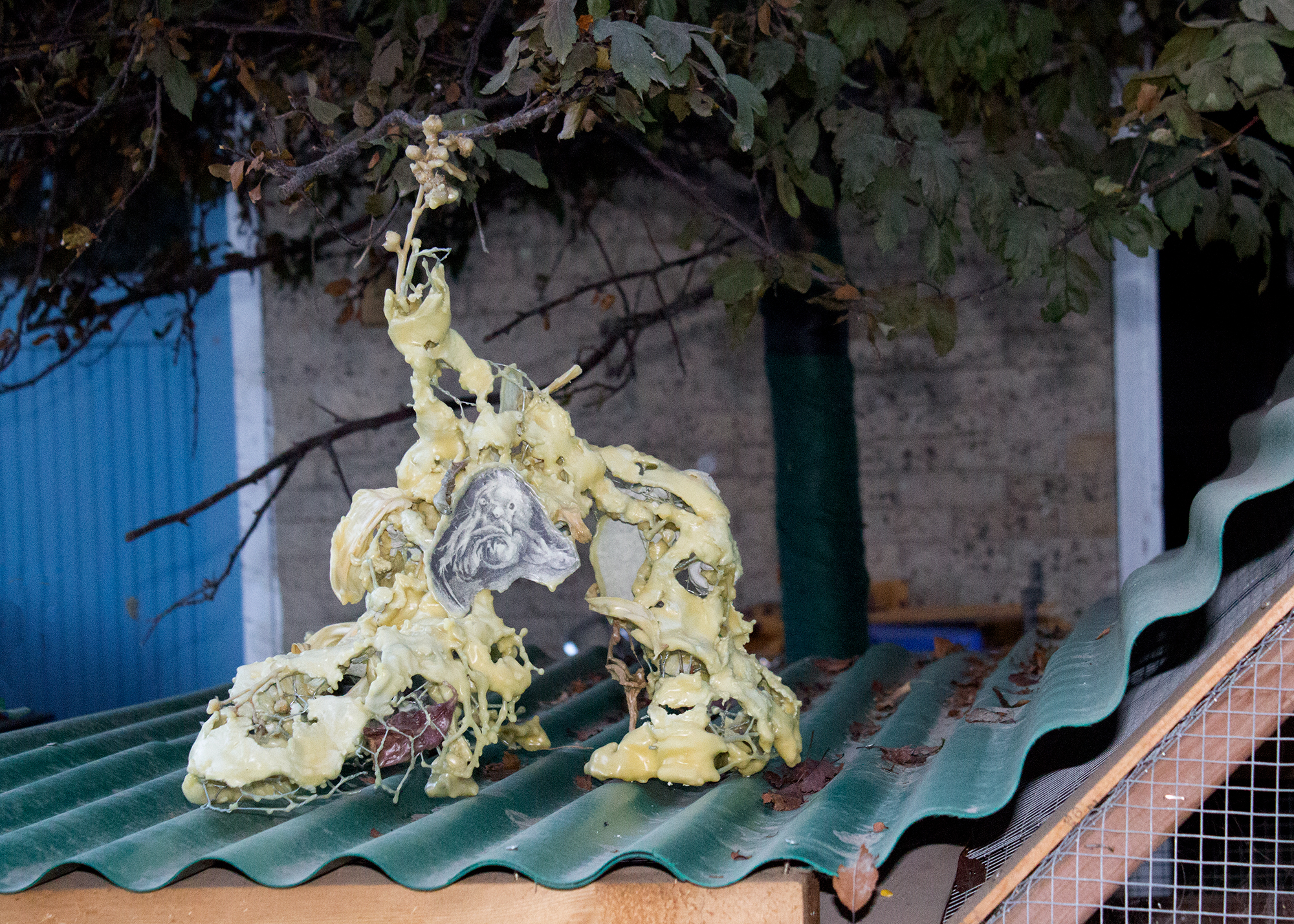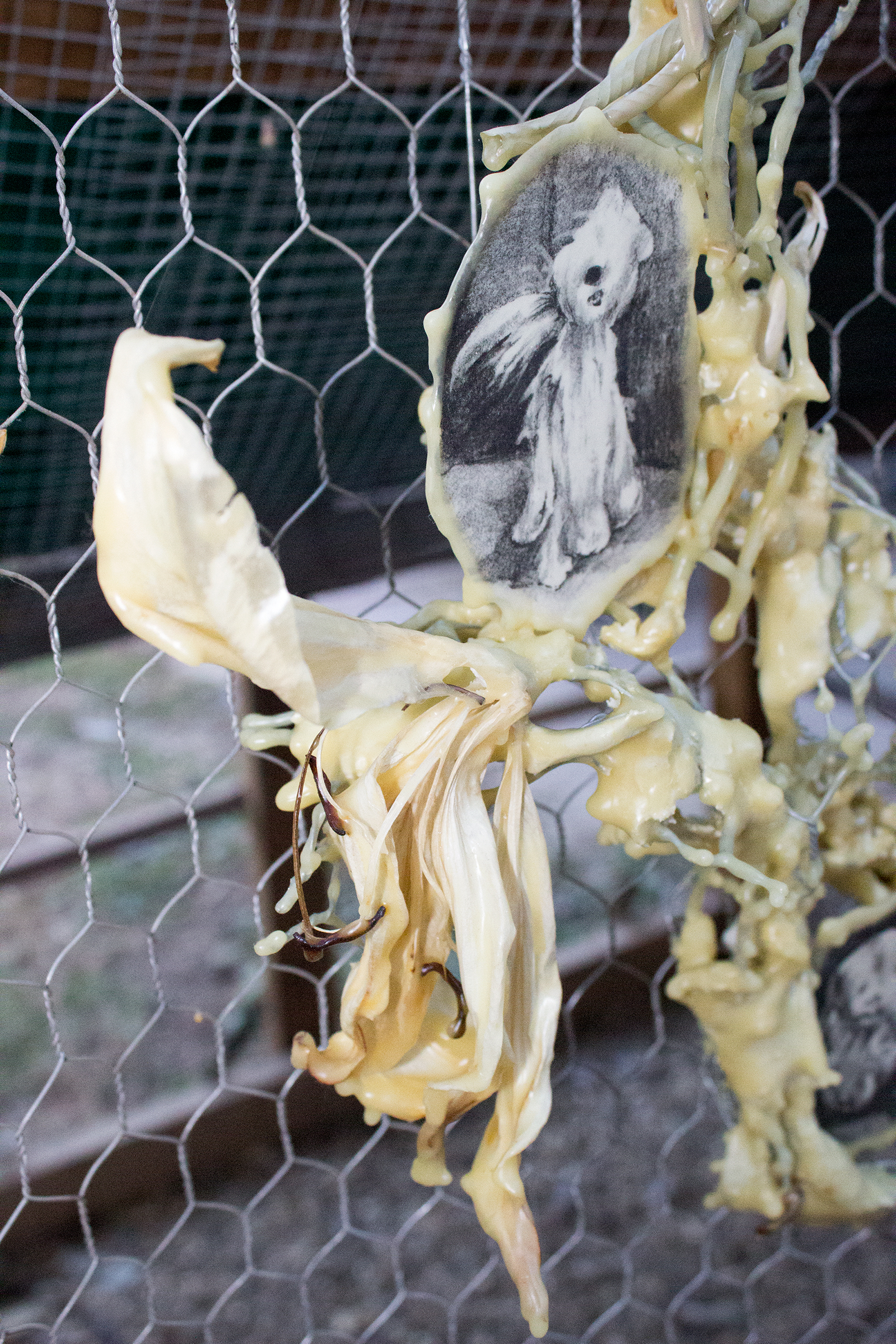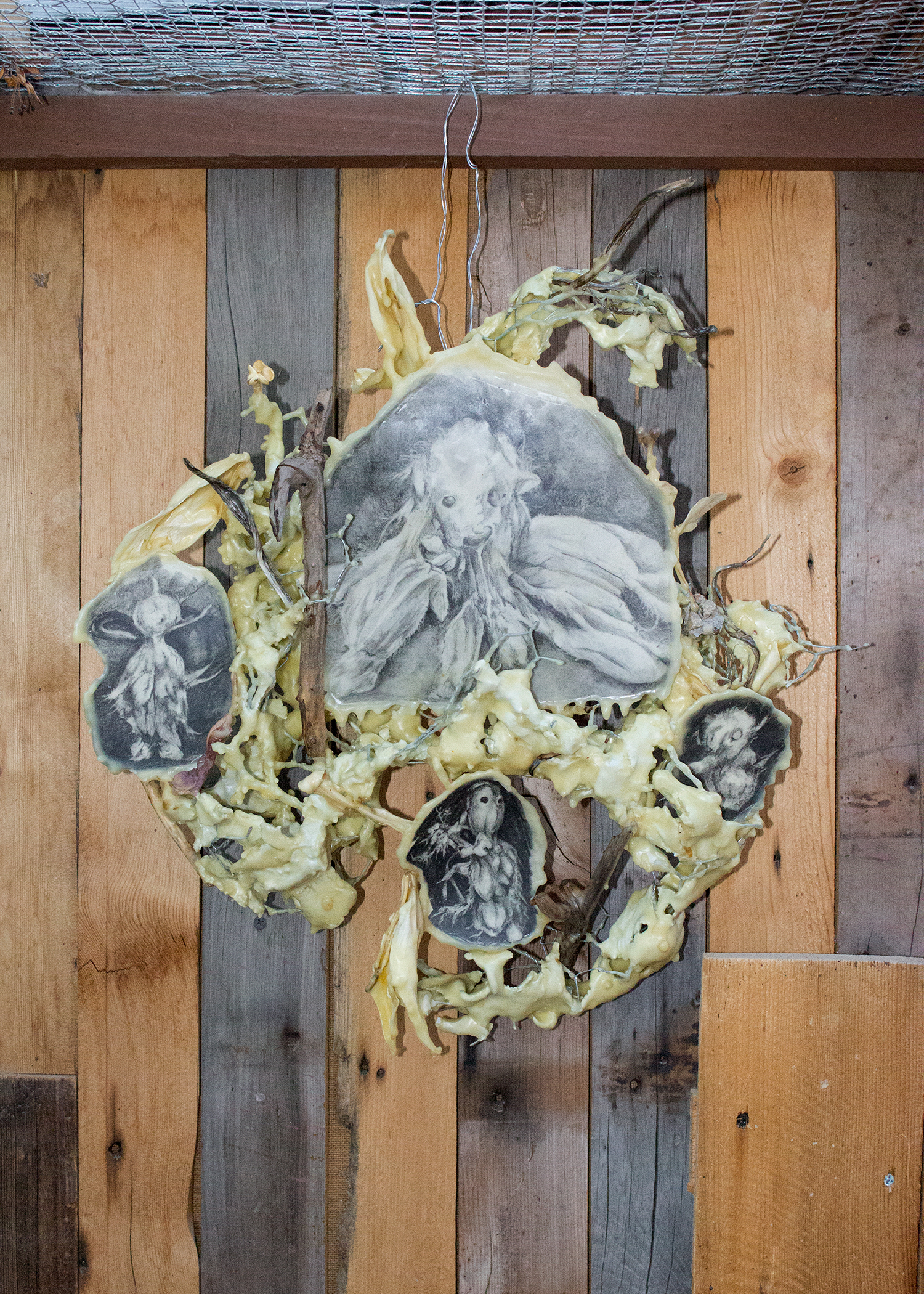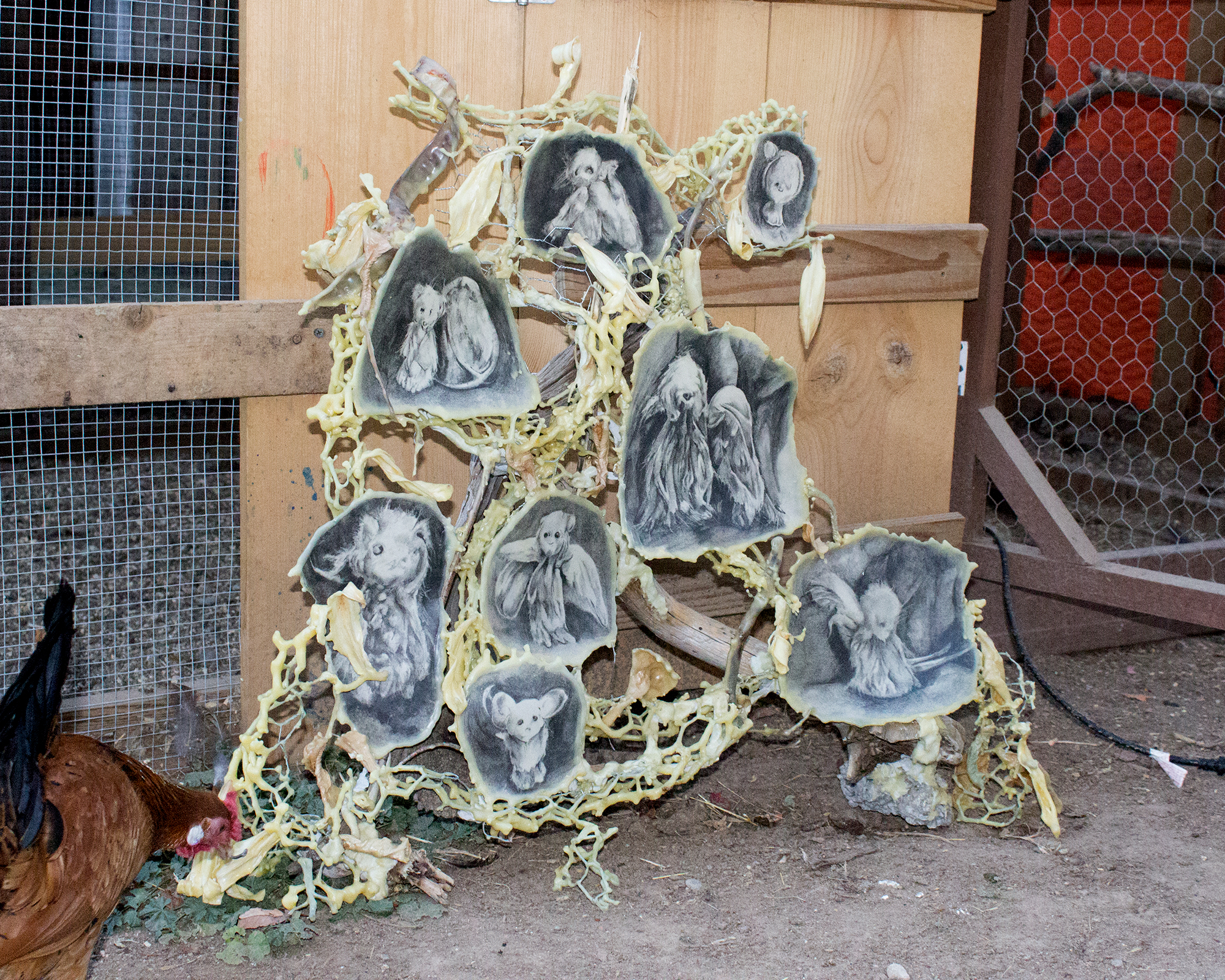 our stuffies, graphite, paper, chicken wire, sticks, flower petals, seed pods, beeswax, damar resin, epoxy clay, concrete, beetle galleries, leaves, roots, 2019-20